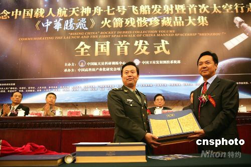 圖為第00081號《中華騰飛》火箭殘骸郵票珍藏品大集,贈送給中國軍事博物館永久收藏。中新社發(fā) 趙雋 攝