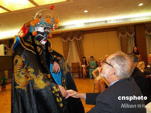 當(dāng)?shù)貢r(shí)間10月8日,中國駐洛杉磯總領(lǐng)館舉行“紀(jì)念中美建交30周年茶話會”,洛杉磯世界事務(wù)委員會的美國朋友約一百多人參加了茶話會,共同暢談中美建交30年來的友誼。旅美京劇演員劉小任表演“變臉”,贏得滿堂喝彩。 中新社發(fā) 盧威 攝