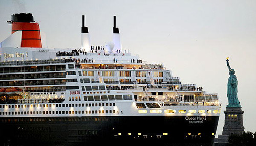 10月16日,巨型郵輪“瑪麗女王二號(hào)”從美國(guó)紐約哈得孫河口的自由女神像前駛過(guò)。