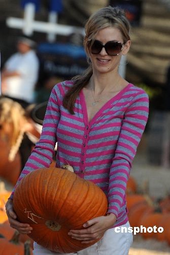 “萬圣節(jié)”將至,許多美國(guó)洛杉磯市民來到遠(yuǎn)近聞名的貝弗利山莊“骨頭先生南瓜田”,選購(gòu)自己中意的南瓜。圖為美女抱得南瓜歸。中新社發(fā) 張煒 攝