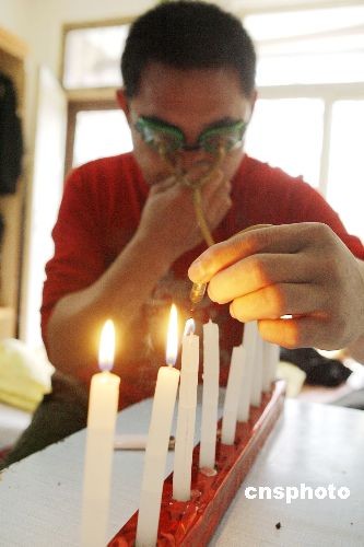 10月21日,開封民間藝人凌春江用眼睛將蠟燭吹滅。他戴上特制的眼鏡,從兩眼中聚氣到一根管子內,一分鐘吹滅一排蠟燭。如今,身懷絕技的凌春江被中華民間絕技藝術團聘為特邀演員,經(jīng)常到全國各地巡演。中新社發(fā) 慎重 攝