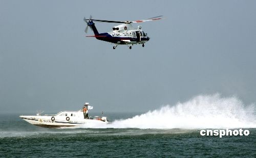 圖為直升機和海上救助船舶進行救人演練。中新社發(fā) 王東明 攝