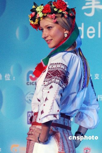 10月23日晚,在北京舉行的2008新絲路世界模特大賽上,各國(guó)參賽選手進(jìn)行才藝展示。圖為參賽選手展示民族服裝。中新社發(fā) 錢興強(qiáng) 攝