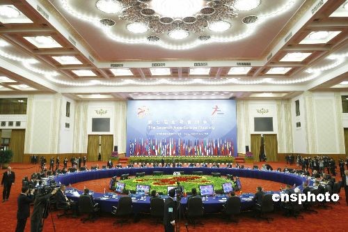 第七屆亞歐首腦會議在北京人民大會堂舉行第一次全體會議,議題是討論國際經(jīng)濟金融形勢問題。中新社發(fā) 盛佳鵬 攝