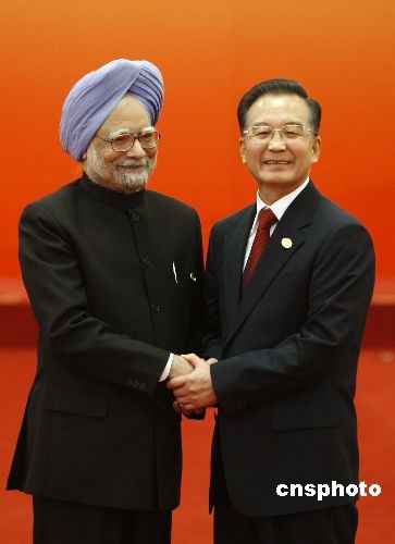 圖為溫家寶歡迎印度總理辛格。中新社發(fā) 盛佳鵬 攝
