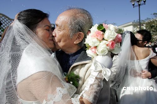 10月26日,11對來自全國各地的新人在北京舉行集體婚禮。婚禮中,中央美術(shù)學(xué)院的吳介琴教授是所有新人里年齡最大的,今年已經(jīng)81歲了。他的愛人蔣曉輝女士今年58歲,兩人相識于網(wǎng)絡(luò)。