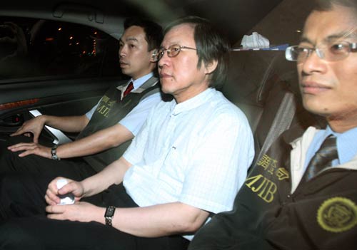臺(tái)灣特偵組30日晚間傳喚臺(tái)當(dāng)局前“國(guó)安會(huì)秘書(shū)長(zhǎng)”邱義仁(中)及5名證人到案。檢察官偵訊后認(rèn)為邱義仁涉嫌利用職務(wù)詐取財(cái)物罪嫌,于31日凌晨將邱義仁移送法院聲請(qǐng)羈押禁見(jiàn)。臺(tái)北法院審理后裁準(zhǔn),邱義仁坐進(jìn)囚車,被送往臺(tái)北看守所。“中央社”圖