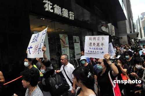 十月三十一日中午,香港約二百名購(gòu)買雷曼產(chǎn)品的投資者,在中環(huán)八間銀行的總行及分行外游行,抗議銀行不負(fù)責(zé)任,誤導(dǎo)他們投資。中新社發(fā) 譚達(dá)明 攝