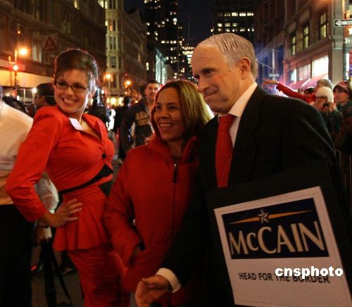 當(dāng)?shù)貢r間10月31日晚,第三十五屆“紐約格林威治村萬圣節(jié)游行”隆重登場,曼哈頓六大道人山人海,盡管面對金融風(fēng)暴,但紐約客依然“群魔亂舞”,極盡瘋狂。有人裝扮成總統(tǒng)候選人麥凱恩和副總統(tǒng)候選人佩林,但立刻有奧巴馬的粉絲向他們高喊:奧巴馬!中新社發(fā) 彭偉祥 攝