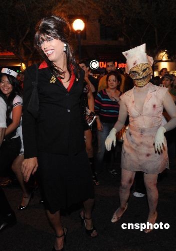 當(dāng)?shù)貢r間10月31日,萬圣節(jié)之夜,一位民主黨的支持者男扮女裝成佩林形象,在街頭巧遇民主黨總統(tǒng)候選人“奧巴馬”!皧W巴馬”始終以正面形象示人,而“佩林”慘遭惡搞。當(dāng)晚,數(shù)十萬洛杉磯市民走上街頭參加萬圣節(jié)之夜大游行,西好萊塢的圣塔莫妮卡大道上“群魔亂舞”,面目猙獰的“妖魔鬼怪”帶來的不是恐怖而是快樂。中新社發(fā) 張煒 攝
