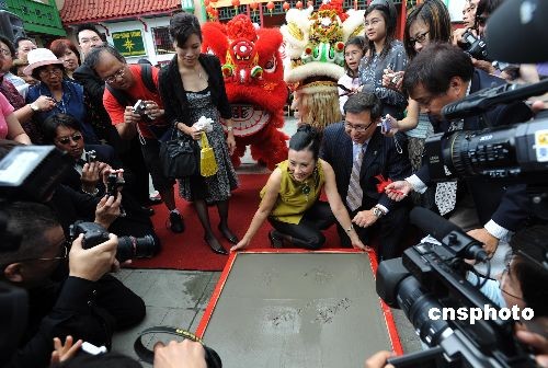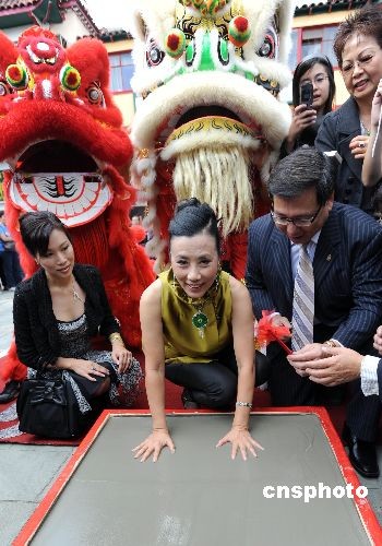 十一月二日,香港著名演藝明星汪明荃來到洛杉磯中國城,在中央廣場留下手印。主辦該活動的羅省中華總商會會長莊佩源稱贊汪明荃為傳播中華文化作出重要貢獻,是所有華人的驕傲。香港明星周潤發(fā)與曾志偉等已在中國城中央廣場內(nèi)留下手印和簽名,羅省中華總商會表示,他們會繼續(xù)邀請為華人爭光的知名人士來此留手印,希望這里成為洛杉磯的第二個星光大道。中新社發(fā) 張煒 攝