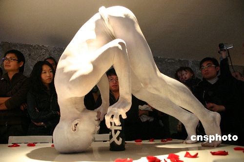 11月2日下午,馬來西亞的華裔舞者李瑞強(qiáng)在北京鼓樓東大街的一家酒吧為大家表演現(xiàn)代舞“人與神”。李瑞強(qiáng)在半露天的環(huán)境中表演個人獨(dú)舞,雖然天氣寒冷,但是他全情投入,演出忘我,使肢體動作沖破語言與文化的障礙,觸動了觀眾的心。李瑞強(qiáng)以為,舞蹈是一種活生生的生命體驗(yàn),是live art。這個舞蹈是為了引發(fā)觀眾對“人+神”主題的聯(lián)想。中新社發(fā) 郭海鵬 攝