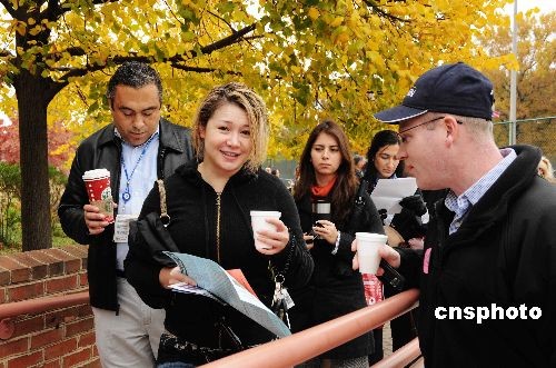 在臨近華盛頓的弗吉尼亞阿靈頓郡中心圖書館投票站,很多選民因?yàn)槠鸬迷,沒有吃早飯,此時(shí)來了兩位送餅干和熱咖啡的?墒,這兩位開口就問:你是奧巴馬的投票者么?一位女士說“Yes!”,于是馬上咖啡餅干免費(fèi)奉上。中新社發(fā) 邱江波 攝