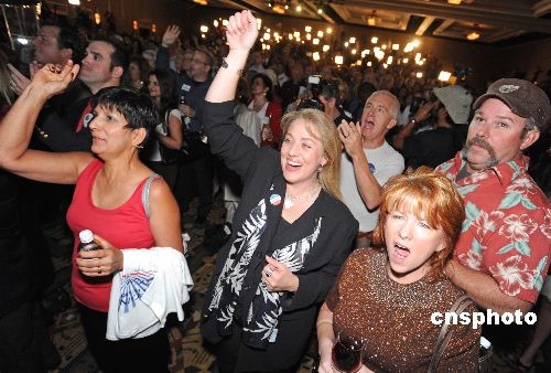 十一月四日傍晚,麥凱恩家鄉(xiāng)的支持者在鳳凰城比爾特摩爾酒店等待美國大選開票結(jié)果。當(dāng)麥凱恩最初贏得弗吉尼亞等州后,現(xiàn)場支持者興奮得手舞足蹈。中新社發(fā) 張煒 攝