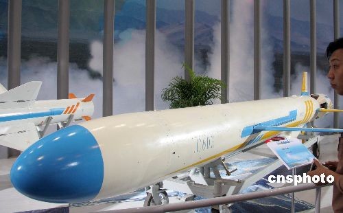 圖為由中國航天科工集團(tuán)公司研制的C602導(dǎo)彈首次亮相珠海航展,也是該型導(dǎo)彈第一次公開露面。C602是新型遠(yuǎn)程反艦導(dǎo)彈,具有射程遠(yuǎn)、命中精度高、突防能力強(qiáng)、毀傷威力大、使用靈活、生存能力強(qiáng)等特點(diǎn),可裝載于機(jī)動(dòng)車輛或水面艦船。中新社發(fā) 孫自法 攝