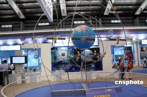 圖為北斗導(dǎo)航試驗(yàn)衛(wèi)星定位系統(tǒng)在中國(guó)航天科技集團(tuán)公司展區(qū)展出。中新社發(fā) 孫自法 攝