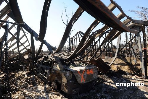 十一月十八日,洛杉磯北部希爾瑪市的一個(gè)居民區(qū)在大火中幾乎被焚毀,整個(gè)社區(qū)六百零八間住宅中的四百八十間蕩然無(wú)存。這是四十多年來(lái),洛杉磯遭受的房屋損失最嚴(yán)重的火災(zāi)。中新社發(fā) 張煒 攝