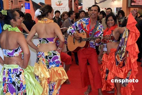 非洲諸多國(guó)家看好中國(guó)公民旅游潛力,在上!岸00八中國(guó)國(guó)際旅游交易會(huì)”上,載歌載舞推介旅游資源。新社發(fā) 潘索菲 攝