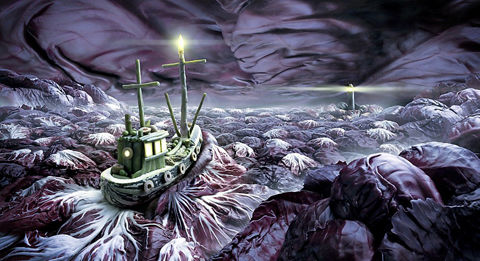 狂怒的大海和暴風雨天空由紅色卷心菜制成,而船體是一個小胡瓜,舵手室是嫩豌豆形成的,而桅桿是直立的蘆筍。