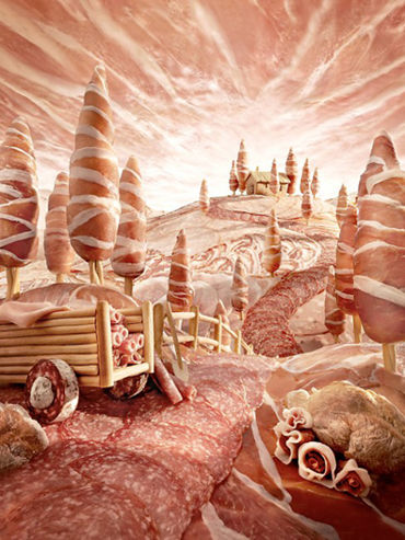 托斯卡納風景是由面包棒打造的小屋、手推車和巖石,意大利冷肉用于裝扮天空、樹木和山丘。