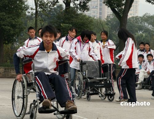 12月2日下午,百余名重慶中學(xué)生參加由英國(guó)駐重慶總領(lǐng)事館文化教育處主辦的校園體驗(yàn)日迷你殘奧會(huì)。他們通過(guò)使用輪椅等殘障人士生活輔助工具進(jìn)行比賽,此次活動(dòng)旨在使學(xué)生們了解殘疾人、關(guān)愛(ài)殘疾人。中新社發(fā) 郭晉嘉 攝