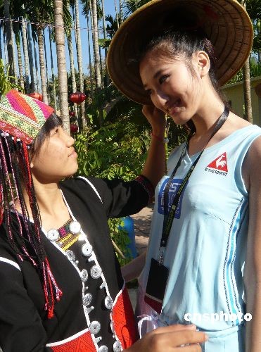 12月2日,正在海南三亞舉行的2008新絲路中國模特大賽總決賽的參賽選手進(jìn)行賽事活動(dòng),參賽的49名男女選手來到美麗的三亞檳榔河生態(tài)新村參觀。圖為黎族姑娘為參賽佳麗戴上斗笠。