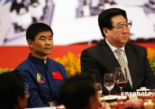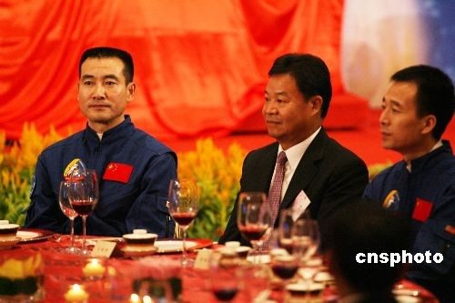 圖為神舟七號(hào)航天員翟志剛、景海鵬等在宴會(huì)上。