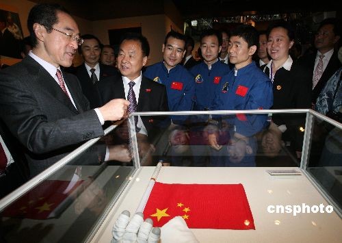 圖為香港政務(wù)司司長(zhǎng)唐英年詢(xún)問(wèn)航天員在太空中展示國(guó)旗的相關(guān)情況