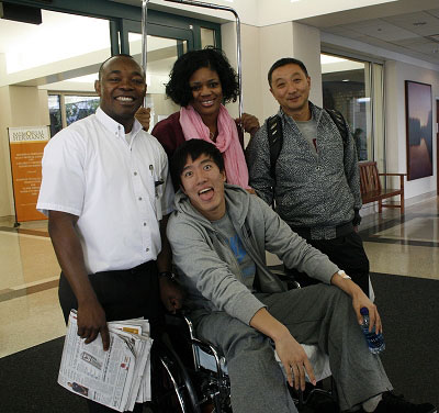 或許是在安靜的醫(yī)院待久了,好動的劉翔一出赫曼紀念醫(yī)院就沖著所有人做起了鬼臉,那個熟悉的劉翔又回來了。不過劉翔的這次亮相有點不同:“飛人”暫時棲息在輪椅上,右腳還包裹著厚厚的紗布,外面再加上一個高至膝蓋下方的護具。