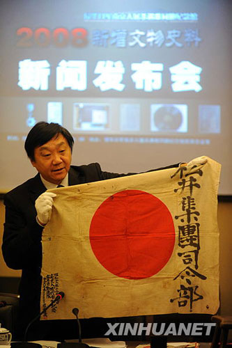 侵華日軍南京大屠殺遇難同胞紀念館館長朱成山在展示當年侵華日軍在南京入城式時作紀念用的日本國旗。韓瑜慶 攝