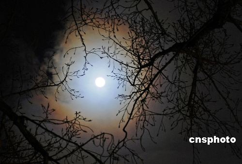 十二月十二日二十二時(shí),北京夜空中的明月出現(xiàn)一圈橙色月暈,該現(xiàn)象在云層映襯在月亮周圍時(shí)出現(xiàn)。據(jù)悉,十三日零時(shí)三十七分,月球、地球和太陽排列成一條直線,此時(shí)月亮最圓,而在六時(shí),月球距離地球全年最近,月亮的視直徑最大。中新社發(fā) 廖攀 攝