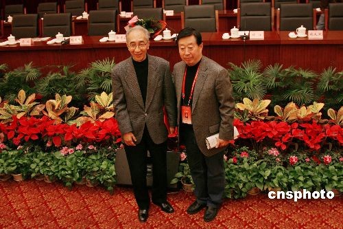 新當(dāng)選的中國(guó)美協(xié)榮譽(yù)主席靳尚誼(左)和新當(dāng)選的中國(guó)美協(xié)主席劉大為合影。中新社發(fā) 王保勝 攝