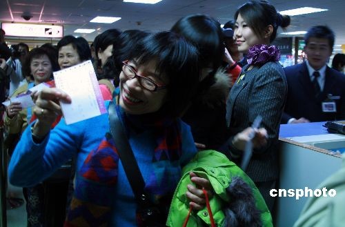 12月15日上午8時,從臺北松山機場飛往上海的航班起飛,這是臺灣首班飛往大陸的平日包機。圖為旅客手持登機牌搭乘首航班機。