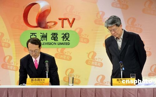 十二月十五日,香港亞洲電視執(zhí)行主席張永霖(左)、高級副總裁鄺凱迎在大埔總臺舉行的記者會上稱,二零零八亞洲小姐競選賽果與投票結(jié)果不符,亞視將對此進(jìn)行調(diào)查。圖為二人就事件鞠躬道歉。中新社發(fā) 鄧慶樂 攝