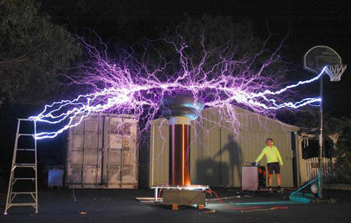 特倫在做實驗時,習慣用一根釣魚竿調節(jié)閃電束的輻射方向。為了營造出五光十色的奇特效果,他通過安裝在照相機上方的一個濾色轉盤,讓“人造閃電”呈現(xiàn)出不同的顏色。由于特倫利用的是“超長曝光”攝影技術,因此能夠在同一張照片中記錄下長達十幾秒的閃電效果。特倫表示:“在照片上,你看得見電火花,卻看不到它們究竟是從哪里冒出來的。這是一種虛幻的效果,可是并非借助Photoshop處理而來——所有一切都是用相機記錄下來的(真實影像)!
