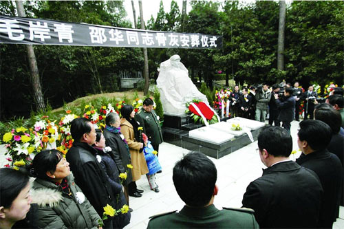 經(jīng)中央批準(zhǔn),毛岸青、邵華同志骨灰昨日(21日)下午由北京遷葬楊開慧烈士陵園,永遠(yuǎn)地留在了媽媽楊開慧烈士的身邊!坝H愛的爸爸媽媽,今天我和妻子劉濱以及你們的孫子?xùn)|東,終于把你們送到了開慧奶奶的身邊,實(shí)現(xiàn)了你們的遺愿!”在骨灰安葬儀式上,毛岸青、邵華的兒子毛新宇動(dòng)情地說。省委書記、省人大常委會(huì)主任張春賢,省委副書記、省長周強(qiáng)向毛岸青、邵華同志敬獻(xiàn)了花籃。