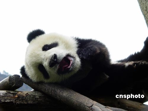 2005年4月19日拍攝的8個(gè)月的“圓圓”,趴在樹(shù)枝上賴床還鬧脾氣。中新社發(fā) 何永果 李偉 攝
