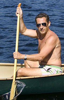 2007年8月4日,法國(guó)總統(tǒng)薩科齊與兒子在美國(guó)新罕布什爾州沃爾夫伯勒的溫尼珀索基湖上劃獨(dú)木舟,享受悠閑的假期。