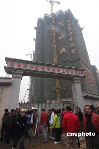 許多人在長沙市井灣子韶山南路634號湖南東方紅建設(shè)集團上海城19棟項目部發(fā)生建筑施工升降機掛籃墜落事故現(xiàn)場圍觀。中新社發(fā) 郭國權(quán) 攝