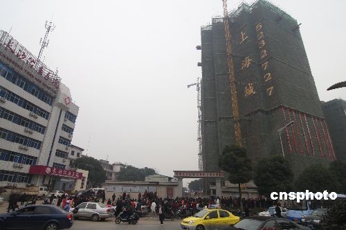 發(fā)生建筑施工升降機(jī)掛籃墜落事故的長沙市井灣子韶山南路643號(hào)湖南東方紅建設(shè)集團(tuán)上海城19棟項(xiàng)目部外景。中新社發(fā) 郭國權(quán) 攝