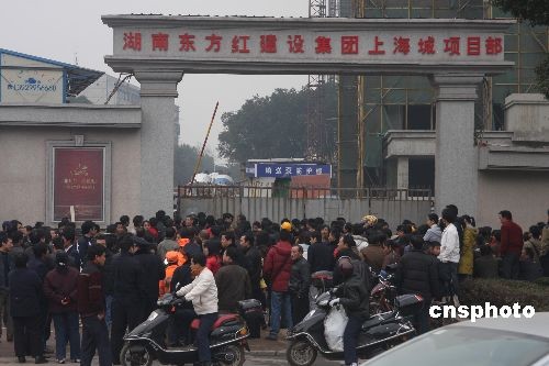 許多人在長沙市井灣子韶山南路634號湖南東方紅建設(shè)集團(tuán)上海城19棟項目部發(fā)生建筑施工升降機掛籃墜落事故現(xiàn)場圍觀。中新社發(fā) 郭國權(quán) 攝