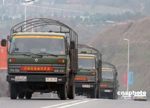 2008年終前,成都軍區(qū)抗震救災(zāi)部隊(duì)冒著余震重返災(zāi)區(qū),每天出動(dòng)一千多輛軍車向北川、汶川、綿陽(yáng)、安縣、江油等地震重災(zāi)區(qū)運(yùn)輸重建家園急需的磚頭。中新社發(fā) 賈國(guó)榮 攝