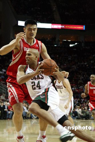 當(dāng)?shù)貢r(shí)間12月31日晚,火箭在主場(chǎng)以85-81苦戰(zhàn)過(guò)關(guān)擊敗雄鹿,姚明拿下了22分10個(gè)籃板!≈行律绨l(fā) 歐文 攝