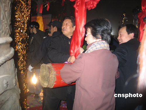 西安:一月一日凌晨,古城西安的南門(mén)城樓、大慈恩寺、小雁塔等地分別舉行了鳴鐘祈;顒(dòng)。圖為幾位普通市民在有著一千多年歷史的唐代小雁塔內(nèi)撞響祥鐘,祈福新年。中新社發(fā) 冽瑋 攝