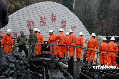 截至1月1日下午,安順透水事故搶險(xiǎn)救援工作仍在緊張有序進(jìn)行。貴州安順市消防支隊(duì)、安順軍分區(qū)等各級(jí)救援部門(mén)的救援人員已增加到500多人,正按照救援專(zhuān)家的預(yù)案,在全力采取抽水等措施緊急救援。目前,抽水設(shè)備已增加到兩臺(tái),礦井內(nèi)的積水正不斷下降。 2008年12月31日凌晨,貴州安順市西秀區(qū)蔡官鎮(zhèn)柏秧林煤礦發(fā)生一起透水事故,13名礦工被困井下。中新社發(fā) 郭勇 攝