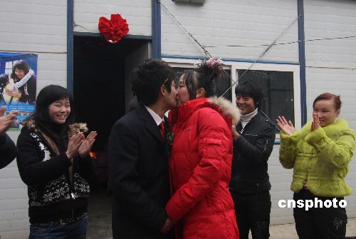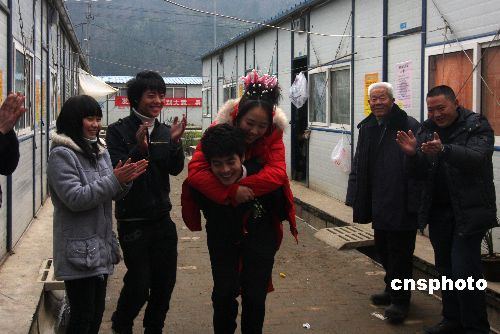 1月6日,地震重災(zāi)區(qū)北川縣曲山鎮(zhèn)王家坪八組王昌明和妻子史悅在安置的板房里舉行簡樸而隆重的婚禮,許多親友和地震災(zāi)區(qū)的群眾送來對(duì)他們新婚的美好祝福,在新年里給當(dāng)?shù)貫?zāi)區(qū)帶來了喜慶氣氛。