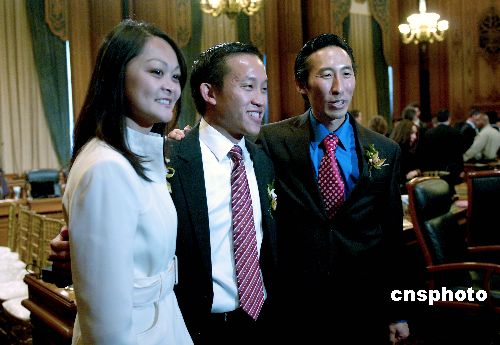 當?shù)貢r間一月八日,舊金山市議會當選議員宣誓就職,并選舉出舊金山歷史上首位華裔議會主席邱信福。舊金山市歷史上首次同時出現(xiàn)三位華裔議員邱信福(中)、朱嘉文(左)和馬兆光。圖為三位華裔議員宣誓后合影。中新社發(fā) 陳鋼 攝