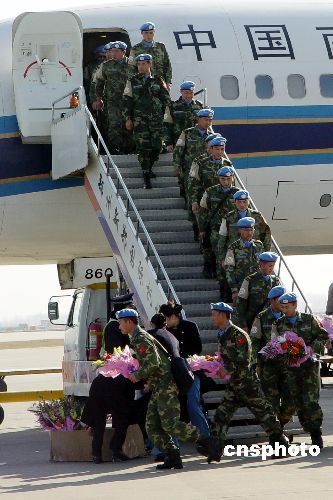 一月十二日上午十時(shí)五十五分許,濟(jì)南軍區(qū)首批赴蘇丹達(dá)爾富爾維和部隊(duì)第一梯隊(duì)一百六十名官兵,乘坐南航客機(jī)平安飛抵鄭州新鄭國(guó)際機(jī)場(chǎng)。中國(guó)首批赴蘇丹達(dá)爾富爾維和部隊(duì)由濟(jì)南軍區(qū)組建,共由兩個(gè)梯隊(duì)三百一十五名官兵組成。第二批回國(guó)的一百五十五人將于本月二十日抵達(dá)鄭州機(jī)場(chǎng)。中新社發(fā) 李志全 攝