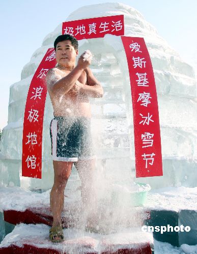 1月12日,“功夫海象”趣味擂臺(tái)賽在哈爾濱極地館再敲戰(zhàn)鼓,打破吉尼斯世界耐寒紀(jì)錄的“冰人”金松浩也參加其中。他與“功夫海象”耶娃在冰冷刺骨的海水中耐寒比拼長(zhǎng)達(dá)一個(gè)多小時(shí)。最叫絕的是金松浩躺在零下30多度的冰床上與“功夫海象”一起比試仰臥起坐,這樣的場(chǎng)面令人驚嘆不已。來(lái)自哈市的6個(gè)家庭及松花江冬泳隊(duì)的6名成員也與“功夫海象”耶娃展開(kāi)激烈角逐。他們?cè)诠枮I極地館的“愛(ài)斯基摩村”里爬冰堡、拉爬犁;三九天在戶外大口大口吃冰棍、啃凍梨、嚼冰糖葫蘆。真是笑傲冰雪,妙趣橫生。中新社發(fā) 姚庭山 攝