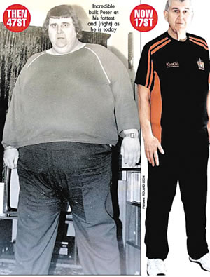 英國(guó)超級(jí)胖司機(jī)為保命減肥380斤:英國(guó)59歲的貨車司機(jī)彼得卡羅爾體重達(dá)到298公斤。肥胖給他的身體帶來了眾多疾病,醫(yī)生向他發(fā)出警告,稱如果再不減肥就應(yīng)該開始為自己準(zhǔn)備葬禮。為了拯救性命,彼得接受了胃旁路減肥手術(shù),接著他到健身館進(jìn)行鍛煉,最后竟成功減掉了190公斤體重。